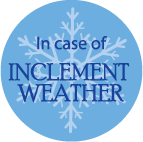 Dark blue text that reads "In case of Inclement Weather" overlaying a light blue snowflake and blue circle.